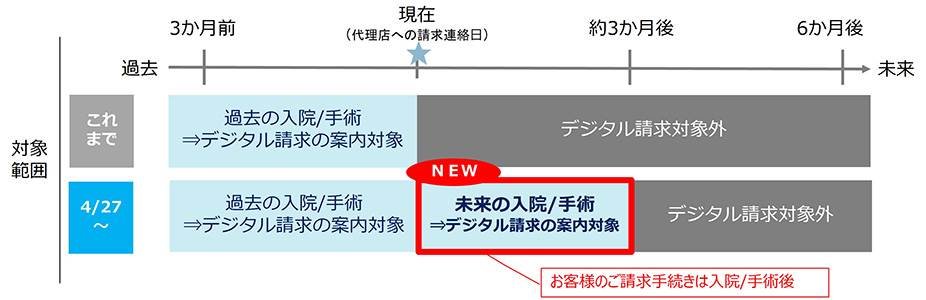これまでは、過去(請求連絡時点まで)の入院・手術がデジタル請求のご案内対象であり、予定している入院・手術は対象外でしたが、代理店に請求連絡をいただいた日から90日先までの入院・手術についても給付金デジタル請求サービスをご案内できるようになりました。