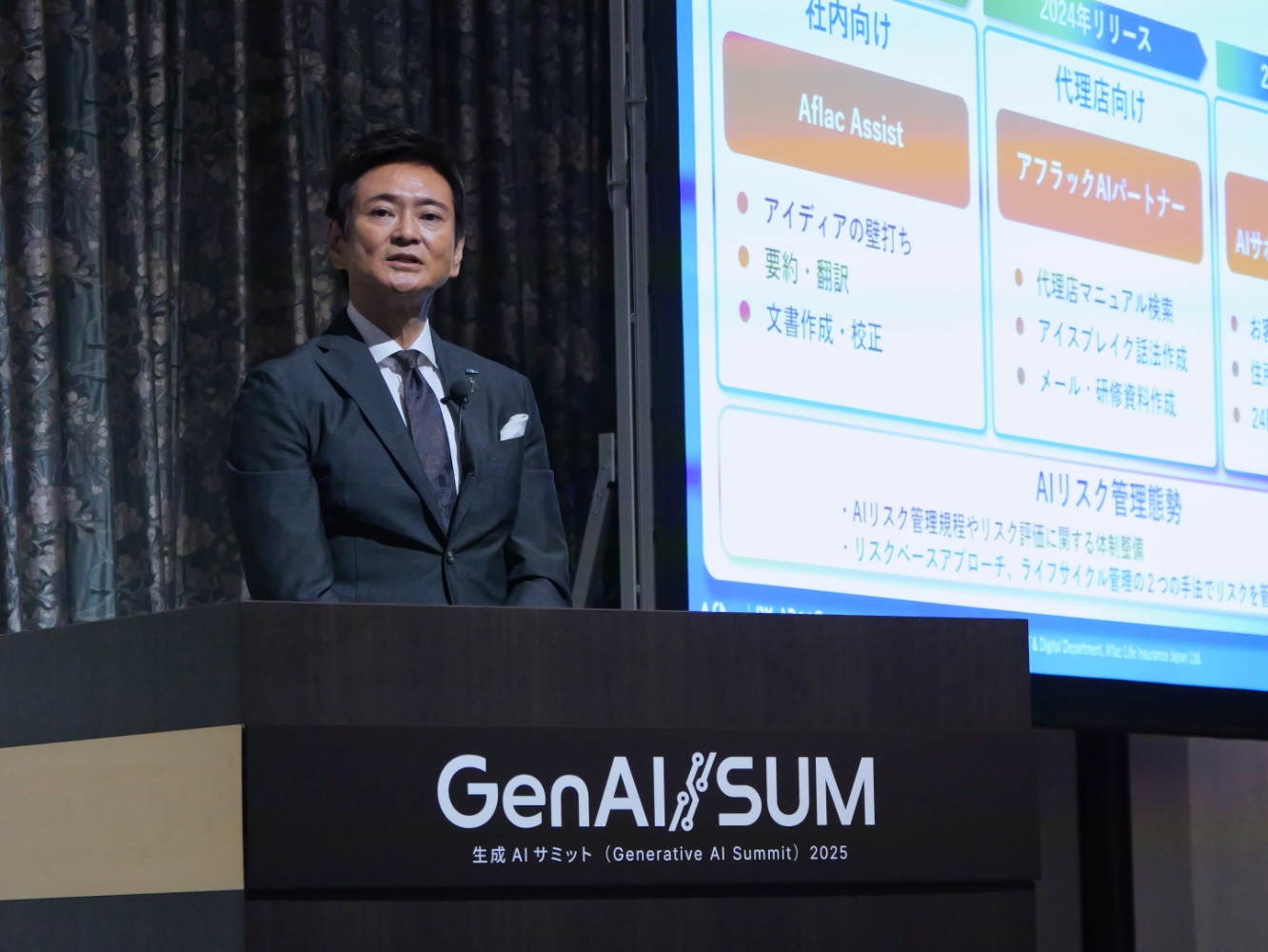 二見は10月6日(月)に、「アフラックが考えるAI共創時代の未来図」と題し、生成AIを活用した新たな顧客体験の提供、業務効率化、社会的課題解決に向けたデジタルサービスの展開など、AI共創時代における当社のビジョンについて講演しました。